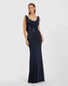 Navy Sleeveless Jersey Cowl Neck Gown With Beading