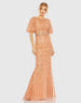 Made from elegant embellished embroidered fabric, this gown features a flattering trumpet silhouette and short flutter sleeves. Perfect for any formal occasion, this gown is sure to make a statement and turn heads.