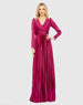 Chic faux-wrap satin gown with puffed shoulders, a v-neckline with a pleated bodice and a full-length pleated skirt.
