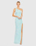 Crafted from luxurious sequin fabric, this stunning gown features a chic one shoulder neckline and a thigh high slit. The elegant draping at the back adds a touch of glamour, making it the perfect choice for any special occasion.