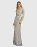 This beaded beauty is a dream-come-true dress. Mac Duggal translates your fantasies on a spellbinding gown made with thousands of seed beads and metallic sequins. The gown is cut in a column silhouette with fitted long sleeves, a decorative illusion bodice with faux sweetheart styling, and a built-in waist belt. A plunging back delivers a sexy sign off.