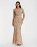Designed to elongate your figure, this gorgeous long-sleeved gown features a semi-sheer bodice and sleeves, allover diagonal beading, and a delicate hand-beaded belted waist.