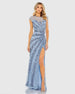 This hand-embellished dress showcases shimmering sequins and intricate beading. Featuring an illusion sweetheart neckline, cap sleeves, and a thigh-high slit, it’s a sophisticated choice for special occasions.
