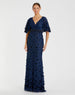 Floral embellished lace gown with beaded accents throughout, a hand-beaded belted empire waist, and semi-sheer butterfly sleeves.