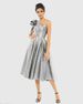 Stunning metallic tea-length dress with dramatic bow one-shoulder detail and functional pockets.