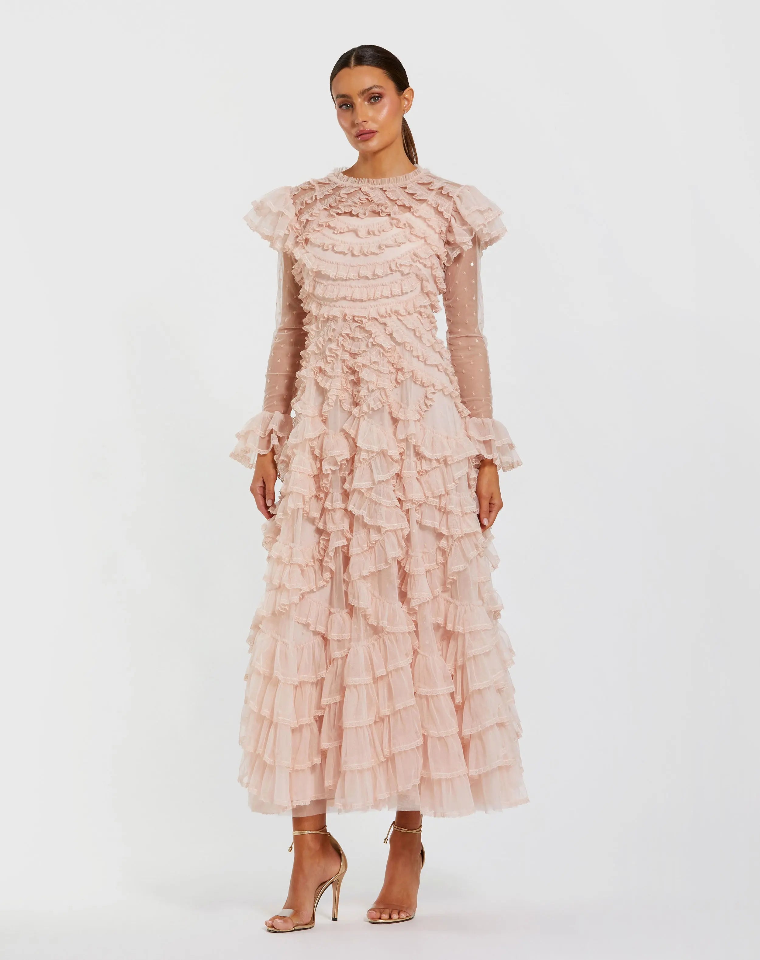 Add a touch of whimsy to your wardrobe with this charming tiered midi dress. Featuring sheer long sleeves, delicate ruffles, and a classic A-line silhouette this dress effortlessly blends playfulness and sophistication.