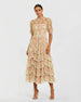 The Beige Lace Trim Printed Mesh High Neck Midi Dress features an illusion high neckline, elbow-length puff sleeves, and cascading ruffle detailing. Its floral print and delicate lace trim add a touch of romantic elegance, perfect for special occasions or a chic daytime event.