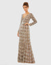 Ombre evening gown with geometric embellishment throughout the mesh overlay. This elegant long-sleeve evening gown features a hand-beaded belt at the natural waist and a floor-length trumpet skirt.