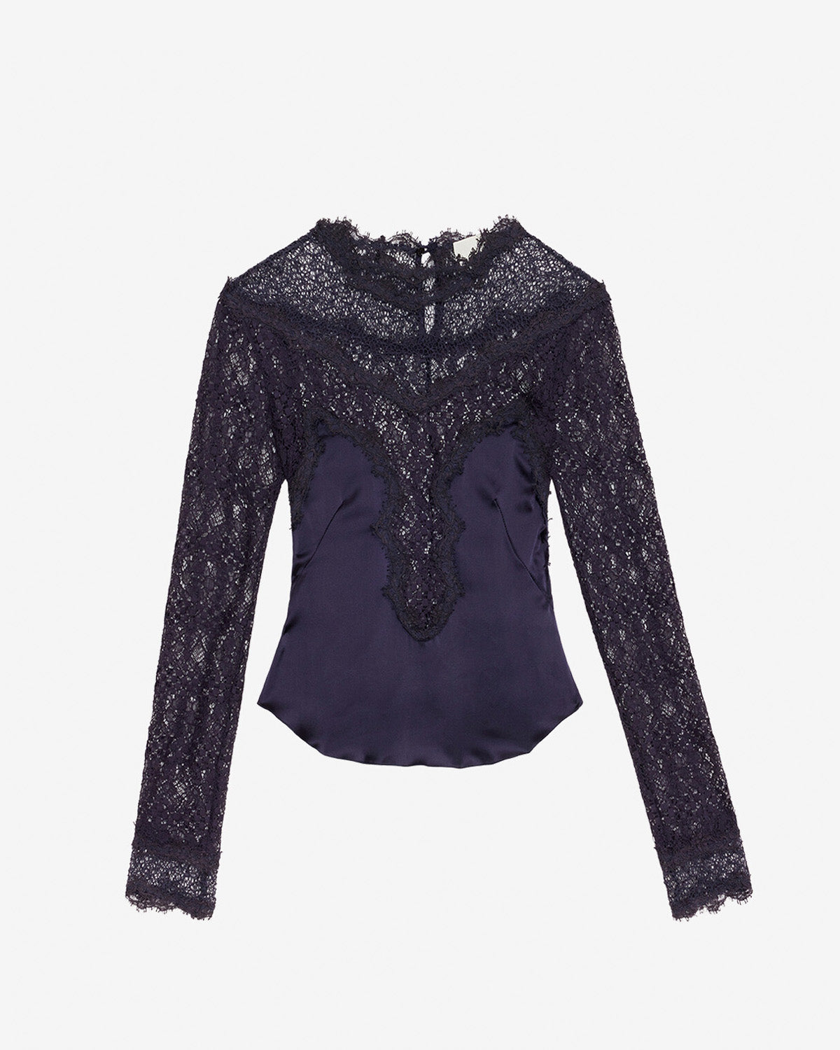 Silk satin blend top with lace yokes