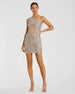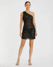 This mini dress captivates with hand-sequined detailing, artfully layered over sheer tonal mesh to create a striking illusion through the midsection. Designed with a sleek one-shoulder silhouette, it’s the perfect statement piece for cocktail events and celebrations.